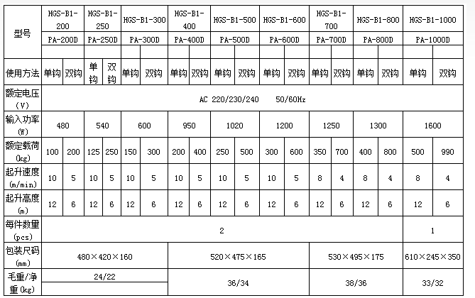 PA1000D微型電動(dòng)葫蘆參數(shù)表: