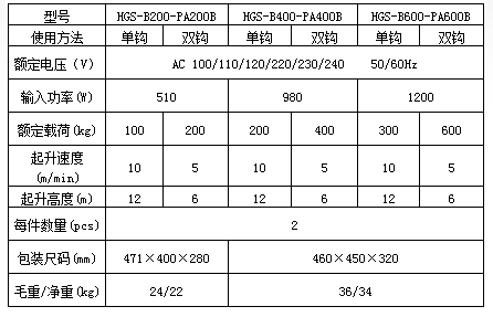 PA400B微型電動(dòng)葫蘆參數(shù)表: